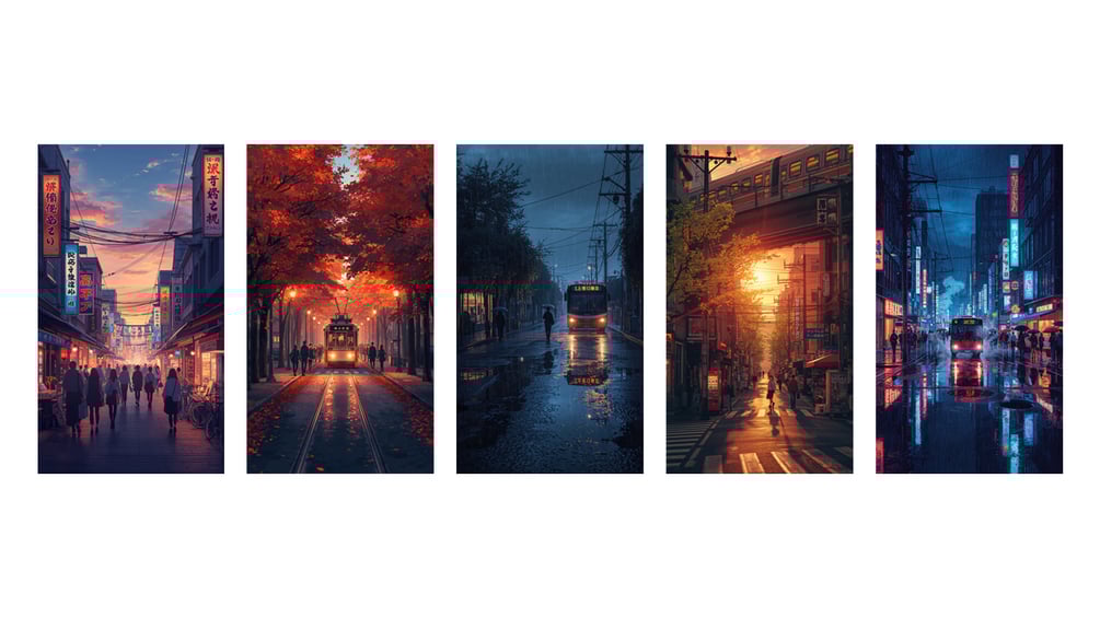 Featuring 10 desktop and 10 mobile wallpapers. Each design captures cinematic slice-of-life moments inspired by Japan — from neon city nights and rainy commutes to cherry blossoms and quiet suburban streets.